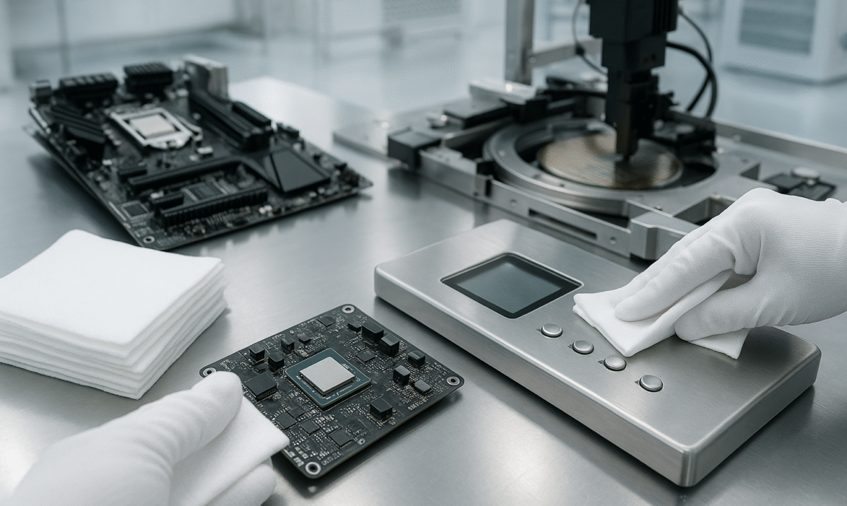 Wafer Processing Areas Semiconductor fabrication requires Class 10 cleanroom conditions where even single particles can destroy products. Our cleanroom-certified nonwoven wipes generate minimal particles while providing effective cleaning of critical surfaces and equipment.